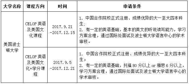依据我校发展国际化教育的方针,为实施我校的教育国际化战略,培养具有国际视野和国际竞争力的高才,鼓励我校学生出国(境)深造获得第二校园的学习经历,2017年秋季,我校将选派指定名额的优秀在校本科生前往美国波士顿大学进行学期访问学习。