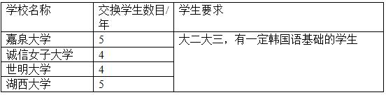 我院与韩国多所大学签订了合作协议,自2007年起分别与韩国多所大学等开展了学生交换项目,每年互派数额相同的学生至对方院校学习半年到一年,学费互免。具体实施项目情况如下: